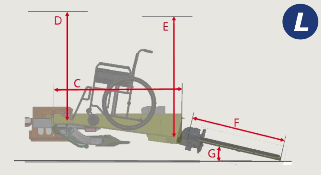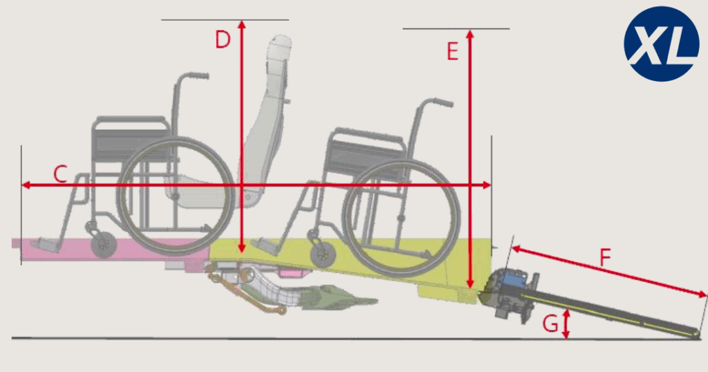 Avec sa capacité d'accueil généreuse, il offre aux passagers en situation de handicap la possibilité d'être positionnés très en avant et à plat à l'intérieur du véhicule, éliminant ainsi l'inconfort lié à une installation inclinée. Cette disposition permet à l'usager de se trouver pratiquement au niveau des places arrière et garantit également un meilleur confort évitant ainsi la sensation d'être assis sur l'essieu arrière du véhicule.