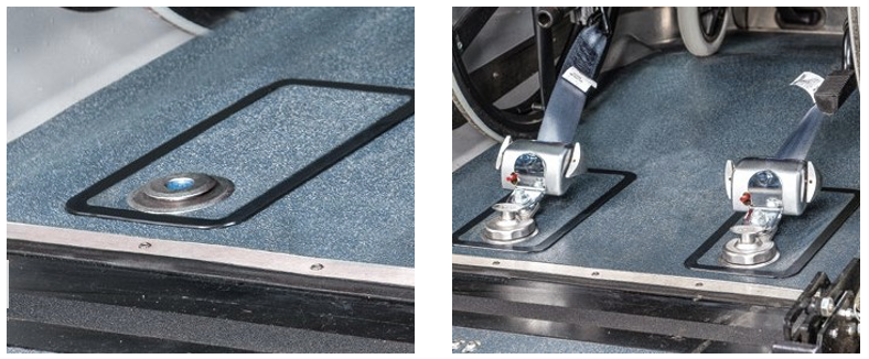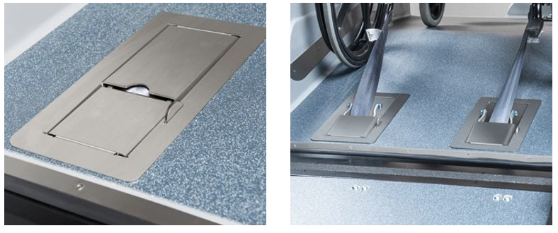 Les dispositifs de sécurité intégrés à cet aménagement sont également de qualité supérieure. Les deux enrouleurs électriques positionnés à l'avant du décaissement, ainsi que les deux enrouleurs manuels à l'arrière, garantissent une fixation sûre et pratique du fauteuil roulant. En outre, une ceinture trois points spécialement conçue assure la sécurité de l'utilisateur en fauteuil roulant, offrant ainsi une tranquillité d'esprit totale lors des déplacements.